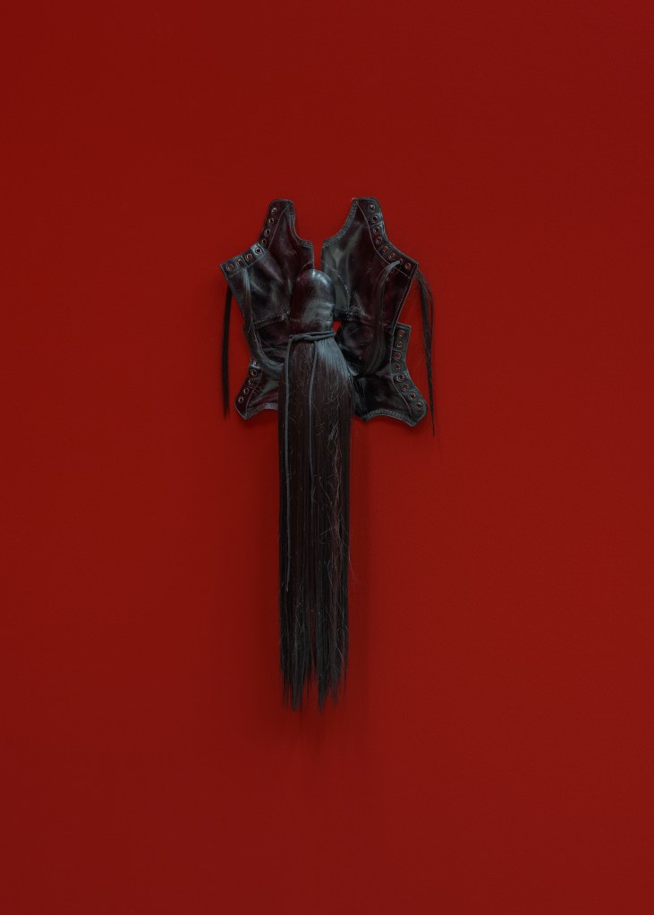 Immer wieder begegnen den Besuchenden der Ausstellung "Barockes Flüstern" Aspekte von Körperlichkeit, auch wenn der Körper in den ausgestellten Kleidungsstücken fehlt, ist er doch stets mitgedacht. Aus Stoffresten, Haarteilen und glänzenden Stoffen zusammengefügte Designs assoziieren in ihrer Ästhetik barocke Kostüme, aber auch im Heute verortetes queeres Nachtleben und Bondage-Kultur. Nach Tieren benannt werden die toten Kleidungsstücke aus der Reihe "Kinky Affairs at Home" beinah lebendig, entwickeln ein Eigenleben, sprengen das Korsett festgefügter Genderzuschreibungen. Die herabhängenden Bänder von "The Spicy Kangaroo" lassen dabei an eine überlebensgroße Figur mit langen, dürren Armen und Beinen denken, assoziieren aber auch einen aufsteigenden Schmetterling, der in einer Metamorphose hin zu seiner wahren Form begriffen scheint. Sie ermutigen in Kombination mit Zeichnungen grotesker Figuren, in Übersetzungen nicht zu entschlüsselnde, historische Bestiarien, zu einem Leben entgegen der Norm, abseits gesellschaftlichen Zwangs. Vielleicht fühlt sich selbst größer, wer all das ablegen und eins der Kleidungsstücke anlegen kann.