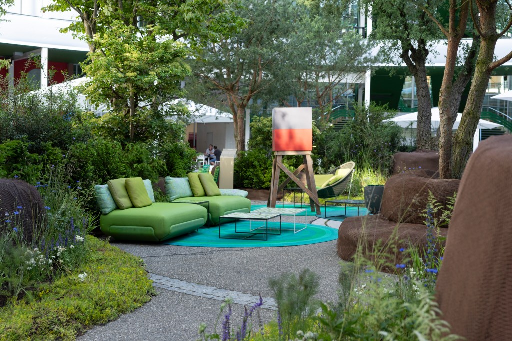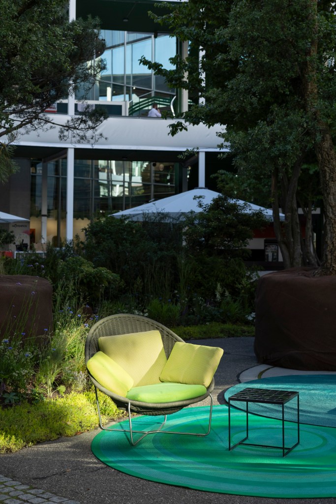 entworfene Sofas und Sessel mit Sitzflächen aus farbigen verspannten Kletterseilen, wie man sie im Bergsport verwendet, rundeten den auf Recycling und Nachhaltigkeit abzielenden Gesamtentwurf ab.