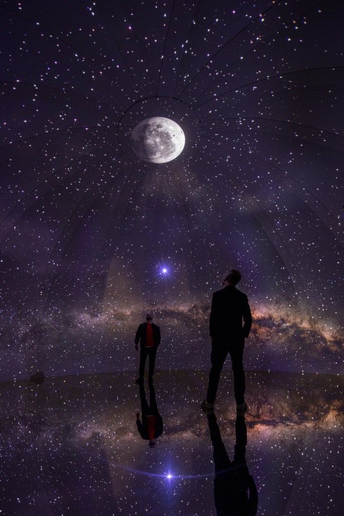 In der Ausstellung "Leandro Erlich. Schwerelos" spielt der Künstler mit unserer Wahrnehmung. Schon beim Betreten der dunklen Ausstellungshalle wird klar: Hier werden die physikalischen Gesetze zur Disposition gestellt. Die Welt steht buchstäblich auf dem Kopf! An der Decke der Ausstellungshalle befindet sich ein 36 × 36 Meter großes Bildobjekt mit dem Titel Soprattutto. Das, was man beim Blick nach oben sieht, erwartet man eigentlich auf dem Boden: Es ist das Luftbild einer fiktiven Landschaft, wie wir es von Karten und Satellitenaufnahmen kennen. Doch die schwebende Installation ist nur der Auftakt einer faszinierenden Reise. Ein mehrstöckiges, entwurzeltes Haus hängt in voller Größe in der luftigen Halle. Der Mond, scheinbar von seiner Umlaufbahn abgekommen, hat sich auf die Erde begeben und enthüllt in seinem Inneren einen künstlerischen Blick in die Tiefen des Universums. Und dann ist da noch ein Raumschiff. Die Besucher:innen können sich im Inneren des 13 Meter hohen Spaceship schwerelos wie Astronaut:innen fühlen.