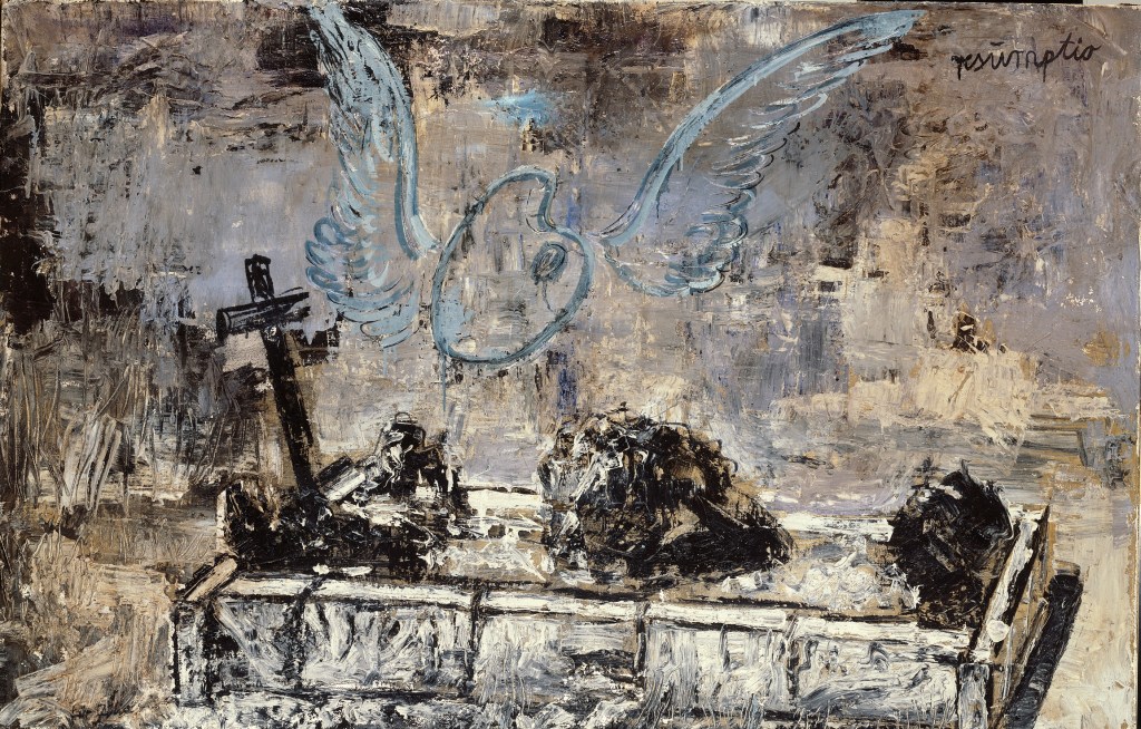Eine geflügelte Palette schwebt über einem Grab in dem 1974 entstandenen Gemälde Resumptio, der Titel eine Verschmelzung von Resurrectio – Auferstehung – und Assumptio – Mariä Himmelfahrt. Das Grab ist durch das christliche Symbol des Kreuzes gekennzeichnet, doch schon hier sucht Kiefer sein Heil in der Malerei. "Ich habe mich schon sehr früh, seit Beginn meiner künstlerischen Arbeit, für religiöse und spirituelle Ideen interessiert", führt der Künstler aus, "und tue dies auch weiterhin, denn die Wissenschaft kann ja keine wirklich zufriedenstellenden Antworten auf die Fragen geben, woher wir kommen und wohin wir gehen." Ein anderes Bild zeigt einen schwarzen Engel, der wieder eine Palette bringt. Der Titel Der Eingeborene bezeichnet dagegen nicht etwa eine anthropomorphe Darstellung Jesu Christi, sondern eine hochformatige Bleitafel mit getrockneten Pflanzen am unteren Rand. 1986, als das Werk entstand, war Kiefer bereits aus der Kirche ausgetreten. "Der Anlass war der Skandal um den Banco Ambrosiano in den achtziger Jahren, der spätestens bekannt wurde, als einer der Hauptbeteiligten tot unter einer Londoner Brücke hing." Es handelte sich um Roberto Calvi, Präsident der mehrheitlich im Besitz des Vatikan befindlichen Bank. In alle möglichen dunklen Geschäfte wie Geldwäsche und Drogenhandel verwickelt, war er erhängt unter der Blackfriars Bridge aufgefunden worden, nach Auffassung der italienischen Staatsanwaltschaft ein Opfer der Mafia.